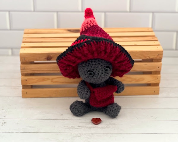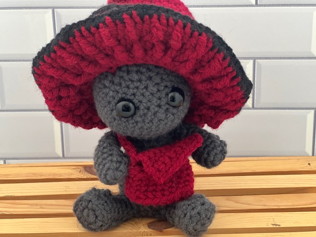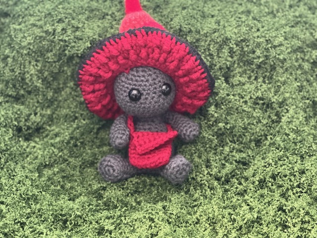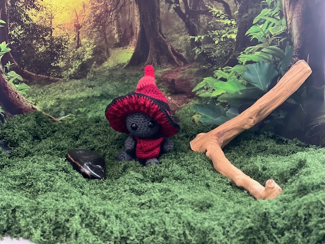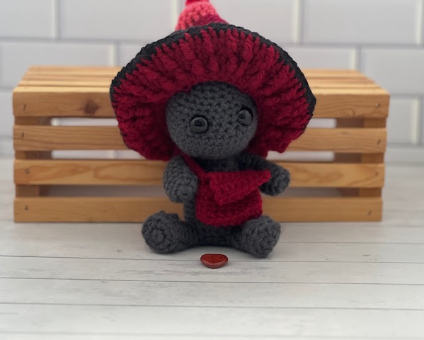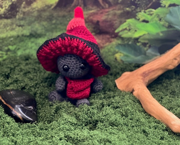 Introducing Eryndor, a mischievous little Impkin with a heart full of courage and a satchel full of secrets. Hand‑crocheted with soft yarn, he wears a twisted mushroom cap that curls like an enchanted forest stem, paired with a matching messenger bag for all his tiny travel essentials.