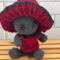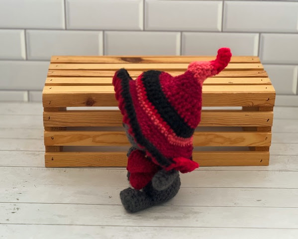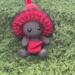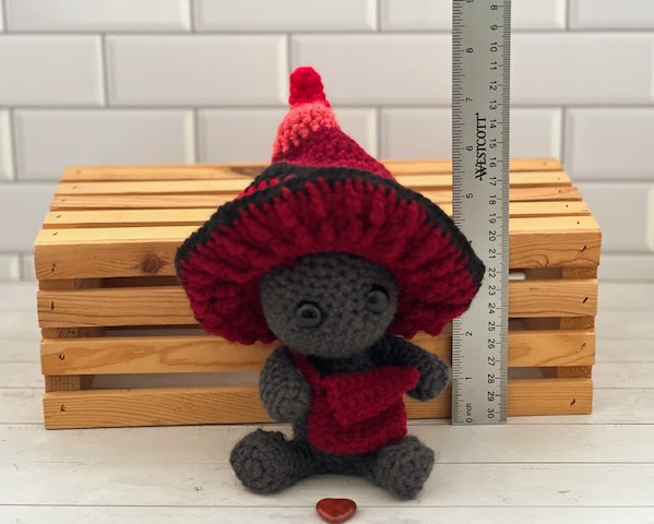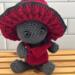 Made with acrylic yarn, support rod, poly pellets, poly fil and plastic safety eyes.